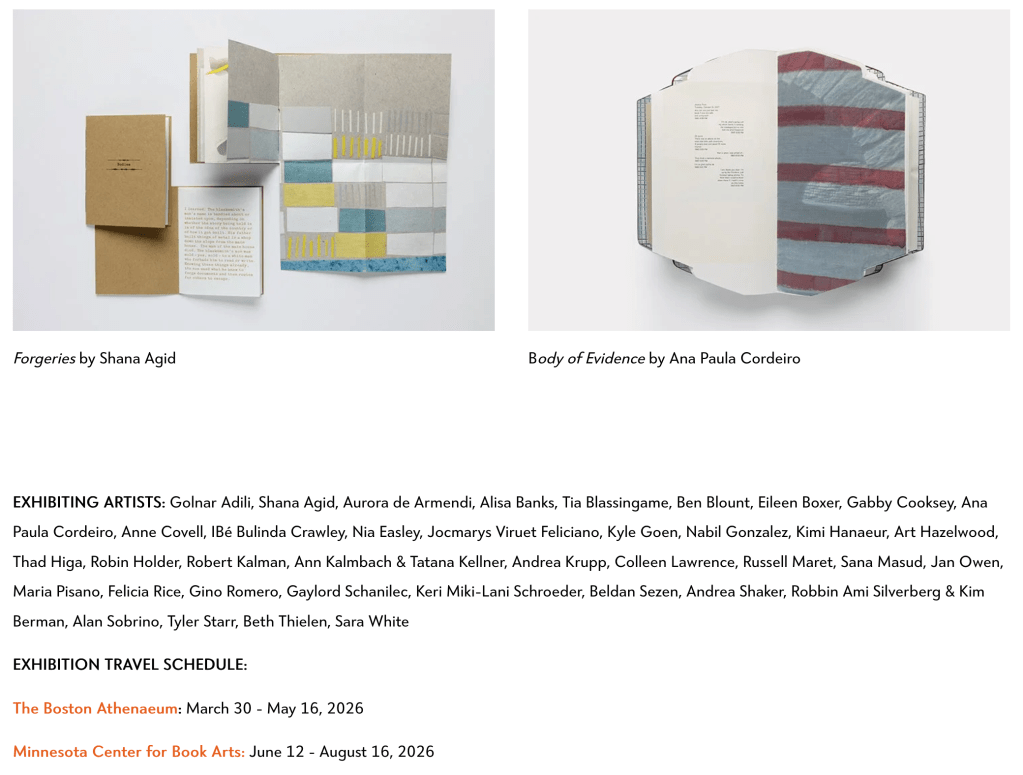 The exhibition, curated by Betty Bright, Mark Dimunation, Maymanah Farhat, Yuka Petz, and Ruth Rogers and organized by the San Francisco Center for the Book, will travel to The Boston Athanaeum and the Minnesota Center for Book Arts.
